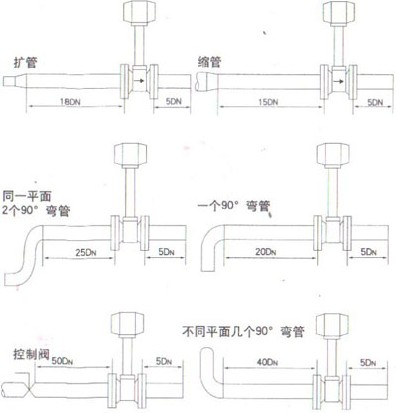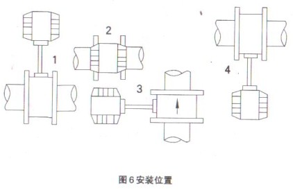 安裝條件:渦街流量計(jì)應(yīng)遠(yuǎn)離振動(dòng)源,有振動(dòng)時(shí)在前后直管段2DN處加支架用橡皮減振。傳感器通徑圓應(yīng)與直管段內(nèi)徑圓保持同心。法蘭焊接時(shí),密封夾緊時(shí),管內(nèi)不得有突出部分。流向應(yīng)與箭頭方向一致。(高溫時(shí)推薦2、3、4位置,常溫和低溫時(shí)推薦1位置,垂直管道時(shí)選3位置)見圖6