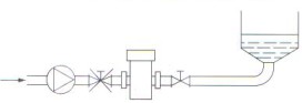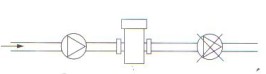 電磁流量計(jì)的傳感器襯里,它與傳感器測(cè)量管管壁一般不粘貼,因此,對(duì)真空負(fù)壓是敏感的。管道內(nèi)真空會(huì)抽癟聚四氟乙烯襯里,使襯里呈波浪型拱起——典型的負(fù)壓破壞形態(tài),這樣破壞了電極的密封,傳感器就不能工作了。因此,PTFE襯里的傳感器不能用于負(fù)壓系統(tǒng),也應(yīng)盡可能避免安裝在可能產(chǎn)生瞬間負(fù)壓的地方。如傳感器不應(yīng)裝在泵的吸入端;閘閥應(yīng)裝在傳感器的后側(cè),如圖所示。