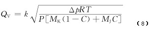 0 引言 針對(duì)瓦斯抽放管道中流量計(jì)量裝置不同的安裝環(huán)境,目前煤礦使用的流量計(jì)主要有差壓式V錐流量計(jì)和威力巴流量計(jì)、熱線式流量計(jì)。差壓式V錐流量計(jì)和威力巴流量計(jì)需要配置信號(hào)處理儀表,但市場(chǎng)上配置的信號(hào)處理儀表只能采集1個(gè)差壓信號(hào)用于計(jì)算瓦斯抽放管道流量,且沒(méi)有考慮環(huán)境條件變化對(duì)流量的影響,不能進(jìn)行實(shí)時(shí)補(bǔ)償,造成流量測(cè)量結(jié)果誤差較大。鑒此,一種具有動(dòng)態(tài)補(bǔ)償?shù)?strong>差壓式瓦斯抽放流量?jī)x表,可同時(shí)測(cè)試管道差壓、管道負(fù)壓、環(huán)境絕壓、管道溫度、管道瓦斯?jié)舛?個(gè)環(huán)境參數(shù),并對(duì)管道瓦斯流量測(cè)量進(jìn)行實(shí)時(shí)補(bǔ)償,提高了流量測(cè)量的準(zhǔn)確性。 1 測(cè)量原理及補(bǔ)償方法 1.1 傳感器測(cè)量原理 差壓式V錐流量計(jì)和威力巴流量計(jì)是由傳感器和信號(hào)處理儀表組成的測(cè)量裝置。傳感器產(chǎn)生一個(gè)依據(jù)流量大小而變化的差壓。具有動(dòng)態(tài)補(bǔ)償?shù)牟顗菏酵咚钩榉帕髁績(jī)x表采集相應(yīng)管道差壓、管道負(fù)壓、環(huán)境絕壓、管道溫度和管道瓦斯?jié)舛?個(gè)環(huán)境參數(shù),用于計(jì)算流量。常用的差壓式流量計(jì)體積流量計(jì)算公式為 式中:QV為體積流量;k為傳感器的結(jié)構(gòu)系數(shù);Δp為傳感器檢測(cè)的差壓;ρ為被測(cè)介質(zhì)的密度。 在實(shí)際生產(chǎn)和測(cè)試中,k,Δp和ρ都可能造成不同程度的測(cè)量誤差。其中k取決于結(jié)構(gòu)加工精密度,出廠前通過(guò)水流量計(jì)量裝置實(shí)流標(biāo)定確定;Δp取決于差壓傳感器精度,出廠前精度通過(guò)壓力計(jì)量標(biāo)校裝置標(biāo)校;ρ取決于現(xiàn)場(chǎng)測(cè)試介質(zhì)狀態(tài),需要根據(jù)介質(zhì)狀態(tài)的變化進(jìn)行實(shí)時(shí)動(dòng)態(tài)補(bǔ)償。 瓦斯抽放管道內(nèi)氣體壓力變化范圍一般為-80~20kPa,溫度變化范圍為0~40℃。管道內(nèi)氣體一般由空氣、CH4及其他烷類氣體組成,空氣和CH4比例占99%以上,因此瓦斯抽放管道內(nèi)其他氣體組分幾乎可以忽略不計(jì),但空氣和CH4的組分比例在不停變化。由此可見(jiàn),介質(zhì)密度動(dòng)態(tài)補(bǔ)償需要從氣體壓力、溫度和濃度3方面來(lái)考慮。 1.2 儀表補(bǔ)償方法 理想氣體狀態(tài)方程: 式中:P為絕壓;V為體積;n為物質(zhì)的量;R為比例常數(shù);T為溫度。 摩爾質(zhì)量計(jì)算公式: M=m/n (3) 式中:M為摩爾質(zhì)量;m為質(zhì)量。 密度計(jì)算公式: ρ=m/V (4) 由式(2)—式(4)可得 ρ=PM/RT (5) 由式(1)和式(5)可得 由于管道內(nèi)氣體主要由CH4和空氣組成,所以混合氣體的摩爾質(zhì)量為 M=MK(1-C)+MJC (7) 式中:MK為空氣的摩爾質(zhì)量;MJ為CH4的摩爾質(zhì)量;C為管道氣體中CH4比例。 由式(6)和式(7)可得