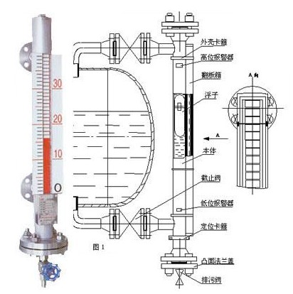 首先,讓我們來了解一下磁翻板液位計的結構:每一臺磁翻板液位計都有一個容納浮球的腔體,稱為主體管或外殼,它通過法蘭或其他接口與容器組成一個連通器;這樣它腔體內的液面與容器內的液面是相同高度的,所以腔體內的浮球會隨著容器內液面的升降而升降;在腔體的外面裝了一個翻柱顯示器,因為我們在制造浮球時在浮球沉入液體與浮出部分的交界處安裝了磁鋼,它與浮球隨液面升降時,它的磁性透過外殼傳遞給翻柱顯示器,推動磁翻柱翻轉180°;由于磁翻柱是有紅、白兩個半圓柱合成的圓柱體,所以翻轉180°后朝向翻柱顯示器外的會改變顏色,兩色交界處即是液面的高度。