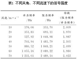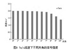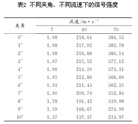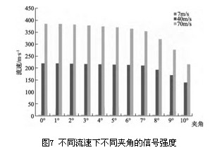 通過仿真模擬,圖4給出流速u=5m/s時,作用在三角柱上的升力系數(shù)和阻力系數(shù)變化曲線。由圖5升力系數(shù)的FFT曲線可以看出其頻率為FL=87.92Hz。從圖6阻力系數(shù)的FFT曲線可以看出其頻率為FD=176.43Hz,約為升力系數(shù)變化頻率的2倍。 為了驗證將FLUENT用于渦街流量計的三維流場仿真的可行性,對不同流速下的升、阻力頻率進行比較,如表1所示。可以看出阻力系數(shù)變化頻率是升力系數(shù)變化頻率的2倍,說明用FLUENT進行渦街流量計的三維仿真是可行的。 4 仿真結(jié)果 基于上述通過升、阻力變化頻率的關(guān)系驗證出利用FLUENT對三維渦街流場進行仿真是可行的。本節(jié)應(yīng)用FLUENT對截流夾角、流速和信號強度之間的關(guān)系進行了仿真研究。分別取7m/s、40m/s和70m/s的流速α的角度在0°~10°范圍內(nèi)取值(發(fā)生體的安裝偏差一般不會超過10°),進行數(shù)值仿真。記錄信號強度,如表2所示。 將表2的數(shù)據(jù)繪制成圖7,將圖7中流速為7m/s的數(shù)據(jù)放大如圖8所示。觀察圖7、8,可以直觀的反應(yīng)出夾角、流速與信號強度的關(guān)系變化。通過對比這3張圖可以看出,信號強度隨著夾角、流速的不同而不同。并從圖中得出結(jié)論: 1)渦街的信號強度與流速成正比,隨著流速的增加,旋渦脫落頻率信號強度會顯著增加。 2)在流速相同的情況下,隨著夾角的增大,信號強度逐漸減小,并隨著夾角的增大,信號強度的衰減程度也逐漸增大。夾角在1°~7°范圍,對信號強度的衰減影響不大,可忽略,超過7°以后對信號強度影響變大,不可忽略。 3)在夾角相同的情況下,隨著流速的增大,信號強度衰減趨勢越來越明顯。 5 結(jié)論 流場仿真在渦街流量計的設(shè)計和完善中正變得越來越重要,它通過理論支持指導(dǎo)仿真的可實施性,并將仿真結(jié)論用于實驗中,提高效率。通過模擬三維渦街流場三角柱繞流現(xiàn)象,將升、阻力頻率進行對比,驗證了可將FLUENT用于三維渦街流場的仿真中。并從不同流速和不同截流夾角兩方面分別考慮,對比分析了三維渦街信號的信號強度,得出夾角在1°~7°范圍,對信號強度的影響不大,超過了7°以后影響變大。從而為以后的實驗做出理論指導(dǎo)。進一步的研究可以通過對不同形狀的旋渦發(fā)生體取不同截流夾角和不同流速進行仿真對比研究。