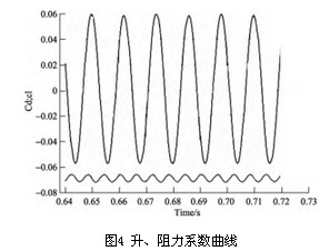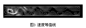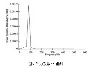 3.2 仿真參數(shù)設(shè)置 在FLUENT中,三維渦街流場參數(shù)設(shè)置如下: 1)流體:空氣(air); 2)湍流模型:Renormalization-group(RNG)k-ε模型; 3)邊界條件 ①流速入口邊界:根據(jù)需要設(shè)置不同流速、湍流動能和耗散率; ②壓力出口邊界:零壓; 4)求解器:基于壓力的三維雙精度瞬態(tài)求解器; 5)數(shù)值計算過程:SIMPLE算法。 3.3 升、阻力變化頻率的計算結(jié)果及分析 圖3所示速度等值。三維渦街流場在夾角為0°,入口流速為5m/s的情況下的速度等值線圖。
