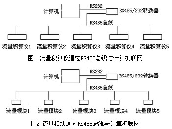 進(jìn)入計(jì)算機(jī),由計(jì)算機(jī)監(jiān)視和管理,這是流量計(jì)量的一個(gè)新的里程碑,它將大大提高流量計(jì)量的可靠性和計(jì)量精度。流量儀表網(wǎng)絡(luò)通訊有兩大發(fā)展趨勢,一種發(fā)展趨勢是近距離的網(wǎng)絡(luò)通訊,如一個(gè)大企業(yè)內(nèi)部流量儀表,可以通過 RS485 總線與計(jì)算機(jī)構(gòu)成網(wǎng)絡(luò),由計(jì)算機(jī)集中監(jiān)測和管理。如圖1、圖2。