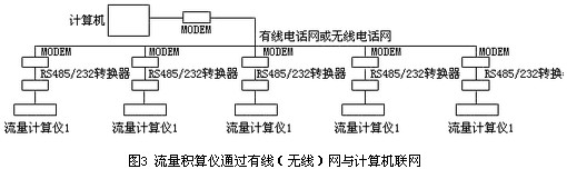 另一種是遠(yuǎn)距離的網(wǎng)絡(luò)通訊,如熱力公司向市內(nèi)的多個(gè)用熱企業(yè)供熱,可以通過有線電話或無線電話,將流量儀表與計(jì)算機(jī)構(gòu)成網(wǎng)絡(luò)。如圖3所示。