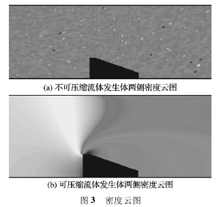 由圖 3 可以看出,不可壓縮流體的密度在仿真過程中沒有發生變化,可壓縮流體的密度發生了變化,必然會導致兩側速度 U1的變化。可壓縮流體經過發生體后密度變小會導致 U1變大。