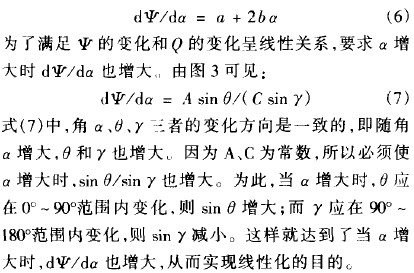 連桿8、9、10的長度分別為A、B、C,連桿8與平衡桿6固定在一起,指針與連桿ro固定在一起。要求轉(zhuǎn)角少的變化和流量Q的變化呈線性關(guān)系,這樣可用d空代替d口,用da代替d人,代人公式(5)得