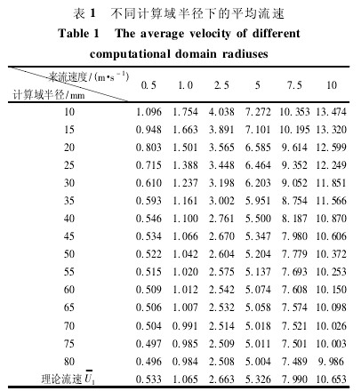 取計算域半徑在 10 ~ 80 mm 的范圍內,通過GAMBIT 軟件分別建立模型,再由 FLUENT 軟件分別進行仿真,得出在不同半徑的計算域內所對應的體積加權平均流速,如表 1 所示。
