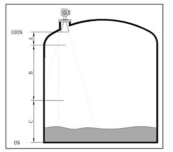 2. 若介質為低介電常數當其處于低液位時,罐低可見,此時為保證測量精度,建議將零點定在低高度為C 的位置。