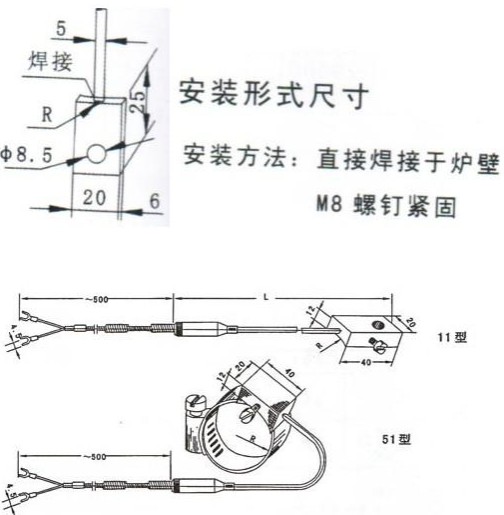 爐壁熱電偶應用 爐壁熱電偶是采用直徑Φ4或者Φ5的鎧裝熱電偶原件作為測溫探頭,測量端用螺釘、抱箍或者焊接(采用熱電阻原件時不宜采用焊接式)等方式將測溫探頭與導熱板表面緊緊貼合在一起,導熱板的另一面有與被測面相同的曲面,導熱板被焊在或者卡箍緊緊與被測爐壁相貼,即可測得爐壁或者管壁的溫度。爐壁熱電偶適用于電廠鍋爐爐壁、管壁及其他圓柱體表面測溫。 爐壁熱電偶主要技術參數 型號及規格