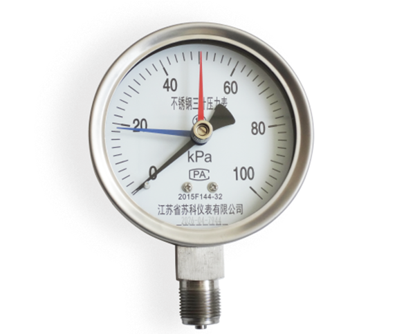 不銹鋼三針壓力表(也稱三針定位壓力表)是一種帶有三根指針的工業(yè)壓力測(cè)量?jī)x表,主要用于監(jiān)測(cè)和限定工作壓力范圍,通過(guò)不同顏色指針清晰標(biāo)示當(dāng)前壓力值及上下限報(bào)警位置+全不銹鋼防腐。